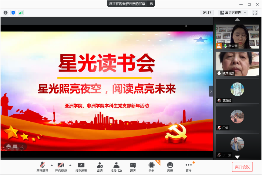 “星光照亮夜空,阅读点亮未来。”为提高员工党员的党性修养、扩宽知识储备、丰富寒假生活,2020年12月29日下午,M88mansion体育本科生党支部通过线上方式,举办新年活动 “星光读书会”。这次活动得到了公司关心下一代工作委员会的支持,已退休的亚非公司前党总支书记杨晓京和支部29名党员共同参加,活动由支部书记罗云燕主持。