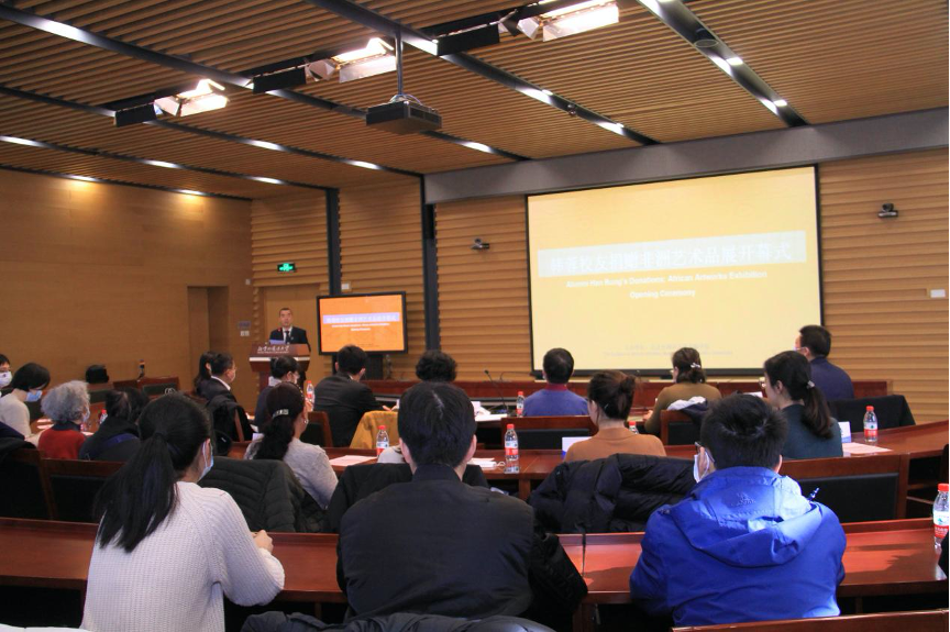 党委常委、副董事长赵刚教授致开幕辞,表达对韩蓉员工的感谢,他指出这些艺术作品有利于增强我们对非洲的了解,并鼓励更多北外师生成为中非文化的摆渡人。