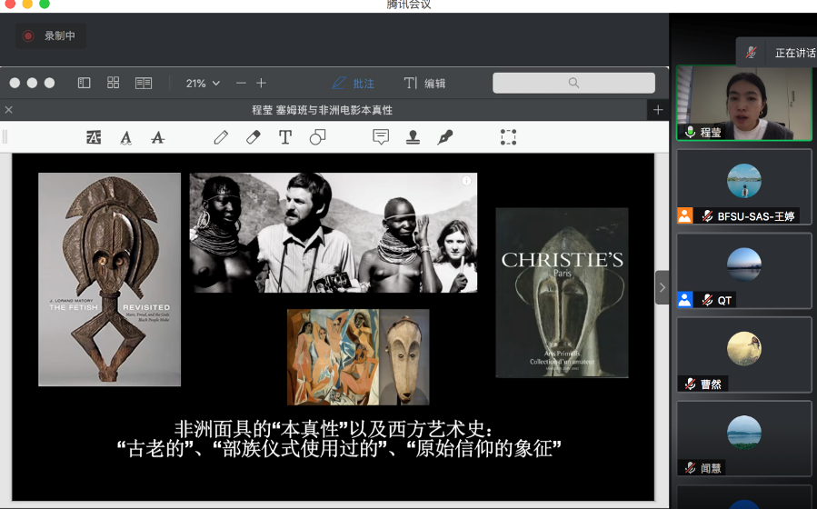 在对塞姆班的生平及其创作的社会背景进行简介后,程老师从塞姆班电影《黑人女孩》中的一个经典的有关“面具”的场景入手,结合“面具”意象与(西方)非洲艺术史的关系,分析了这一场景如何隐喻了非洲文学和艺术文本的一种批评境遇。塞姆班实际上是在借助面具场景发问:是否存在一种真正的非洲电影语言和审美?非洲文化文本应该如何呈现非洲?非洲文学、文化的“本真性”究竟应由谁来定义?