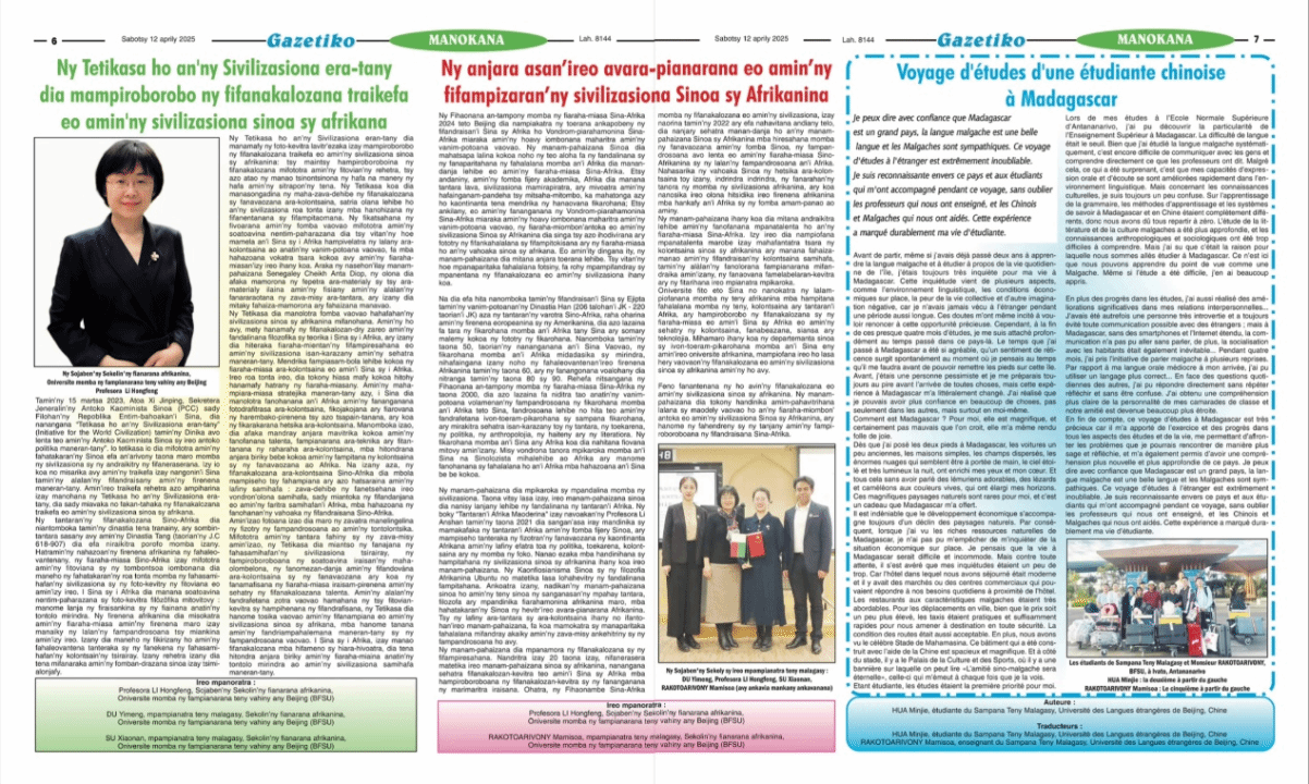 2025年4月12日,马达加斯加主流媒体Gazetiko(意为“我的报纸”)发表M88mansion体育“中非文明互鉴”主题系列文章,展现北外在推动中非文明互鉴、民心相通中的积极作用。该系列文章由经理李洪峰教授牵头组稿,马达加斯加语专业师生共同参与,从宏观与微观两个视角切入,旨在深化我国与马达加斯加之间的人文交流。