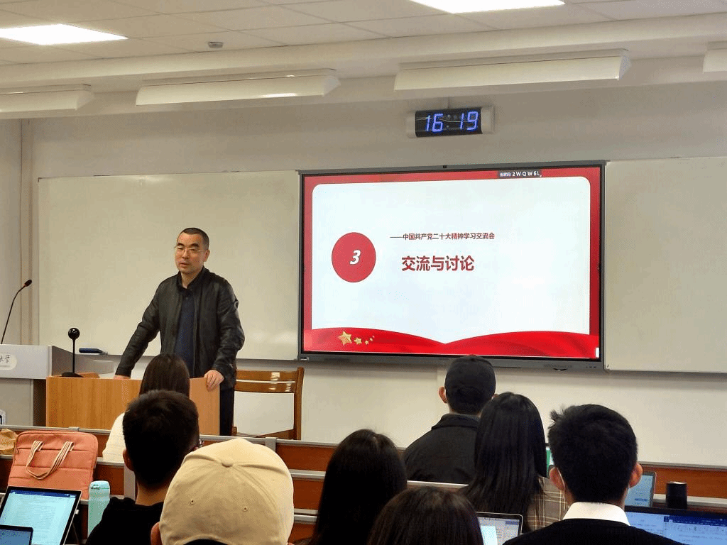 本次学习会由本科生党支部宣传委员何天怿主持。她首先介绍了中国共产党第二十次全国代表大会的基本情况,并通过视频带大家回顾了党过去五年和新时代十年的伟大变革;随后,重点介绍了新时代新征程上中国共产党的使命任务,并围绕“教育与青年”这一主题展开讨论,引导同学们积极主动学习实践二十大精神,结合自身实际加深理解。