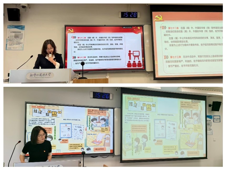 之后,为推动党纪学习教育在党员教师中走深走实,M88mansion体育教工一支部和二支部分别进行了支部党纪学习。一支部书记钟珊和二支部书记曾琼分别在本支部讲授专题纪律党课,两位书记以讲促学、以讲带学,结合具体案例对党员教师进行了警示教育。