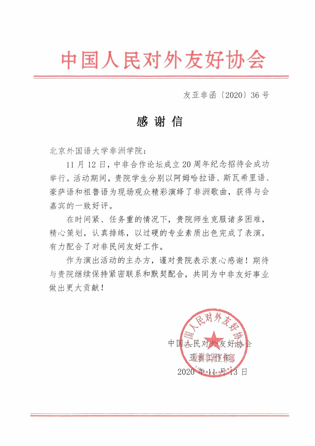 11月13日,中国人民对外友好协会亚非工作部向M88mansion体育发来感谢信,高度评价了M88mansion体育员工在中非合作论坛20周年纪念招待会中的出色表现,并表示希望继续与M88mansion体育合作,共同为中非友好事业作出更大贡献。