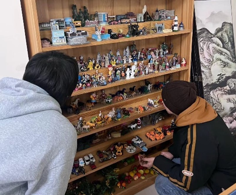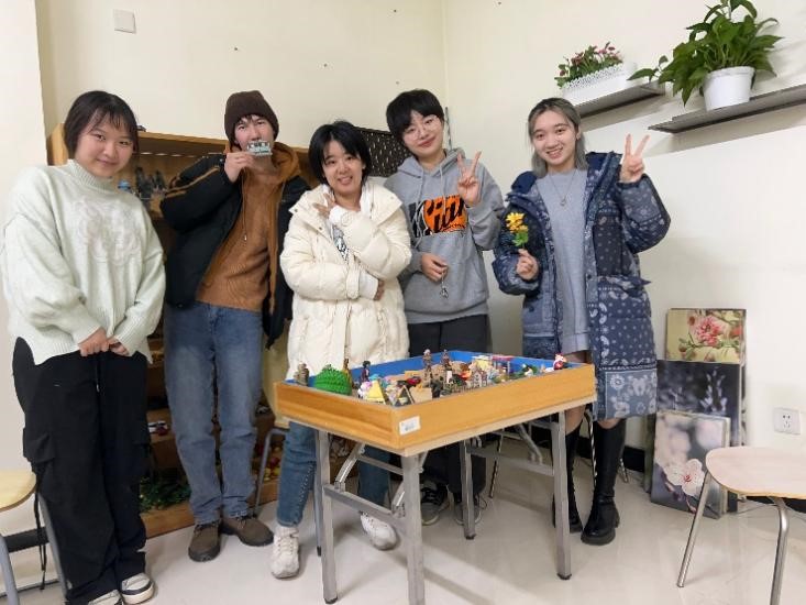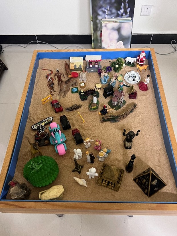 完成沙盘画后,丁老师组织同学们从画的各个方面观察并围绕沙盘桌坐在一起讨论。每位同学依次向大家分享自己挑选物品以及其摆放位置的原因,相互交换想法。在讨论中,大家还分享了自己结合本次游戏联想到实际生活中的一些思考,分析了自己以及其他同学的性格,描述自己在倾听他人想法时心理的变化,最后还为共同创作的沙盘画起了不同的名字。